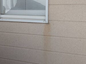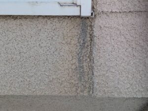 こちらは窓まわりの外壁の様子です。雨水が流れやすい位置のため、黒い筋状の汚れや細かなひび割れが目立っていました。窓の周囲は外壁の中でも特に劣化が出やすい箇所で、放置すると隙間から雨水が浸入し、雨漏りの原因になることもあります。